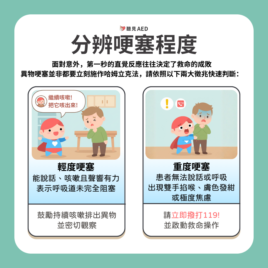 【重度哽塞】:患者無法說話或呼吸,出現雙手掐喉(通用哽塞手勢)、膚色發紺或極度焦慮。