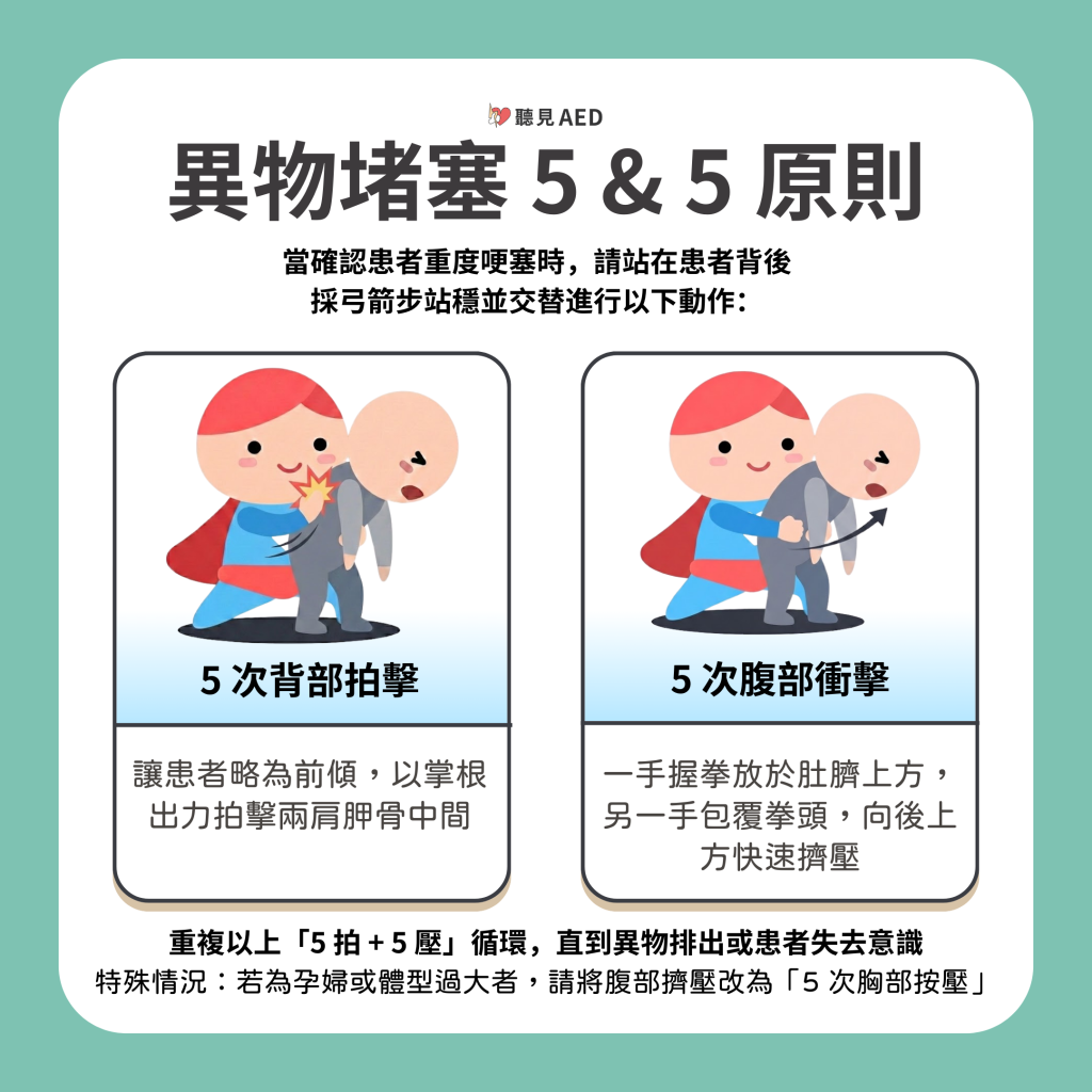 重複以上「5 拍 + 5 壓」循環,直到異物排出或患者失去意識。