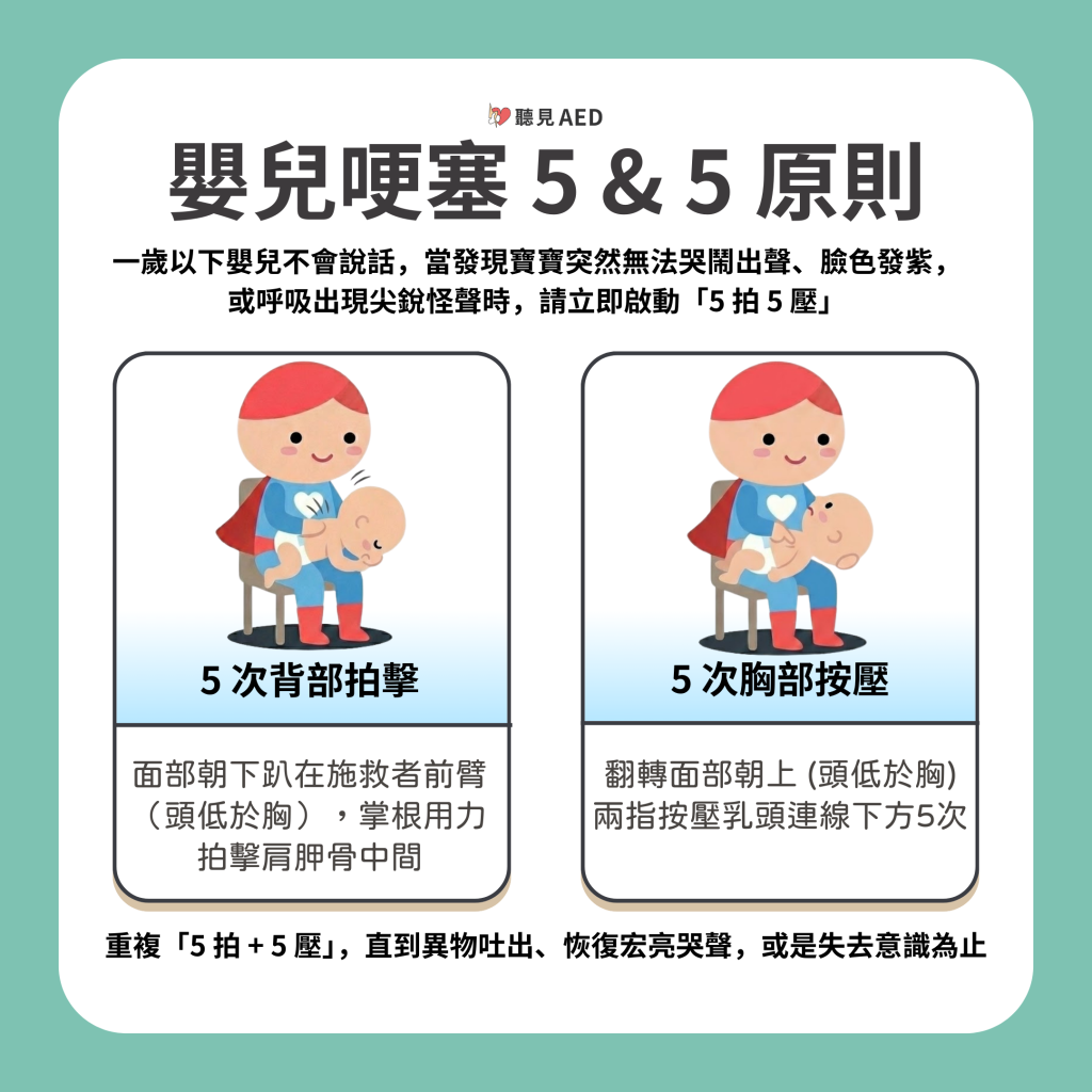 嬰兒不會說話,當發現寶寶突然無法哭鬧出聲、臉色發紫,或呼吸出現尖銳怪聲時,請立即啟動「5 拍 5 壓」: