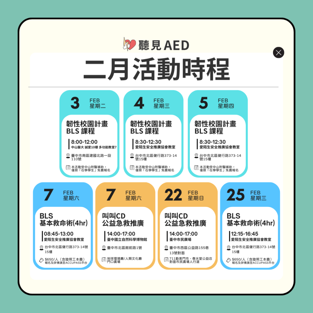 學生限定:2026 韌性校園守護者計畫 最新消息及公告, 活動快訊及成果 / 2025-12-24 2026 年,【聽見AED】臺灣愛陌生安全推廣協會受中山醫學大學附設醫院「健康台灣深耕計畫之韌性醫療」 補助,