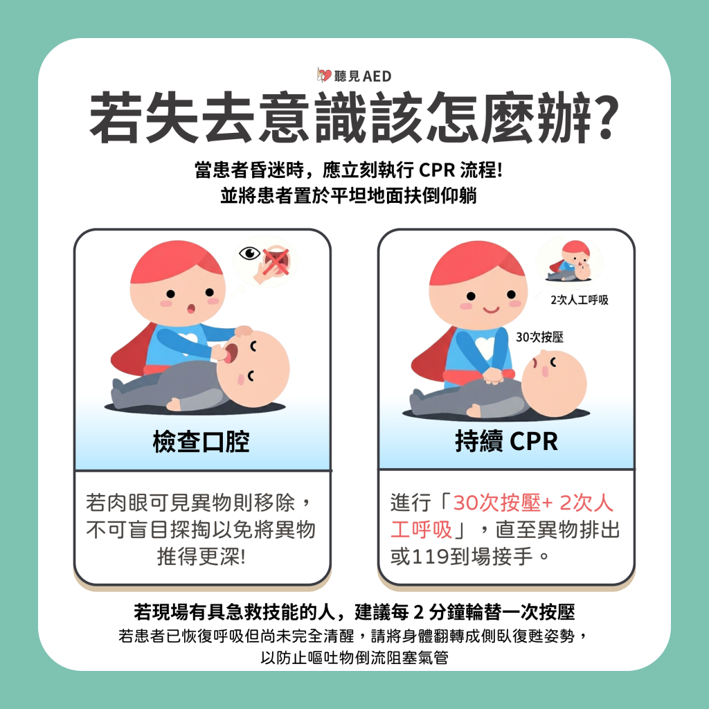 • 持續 CPR:進行「30次按壓+ 2次人工呼吸」,直至異物排出或醫護接手。